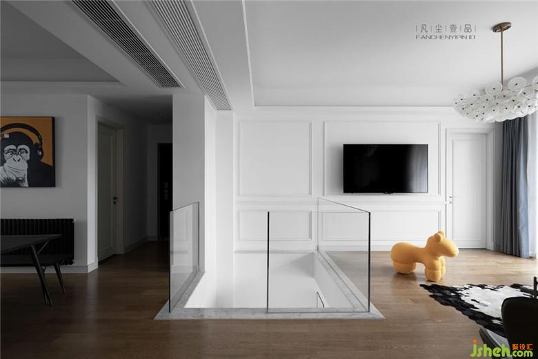 超白鋼化玻璃扶手替換了原本的鐵藝扶手,避免鐵藝制品后期的腐朽問題,美觀上打通了客廳和餐廳的兩個視覺空間,讓整個起居室不再因為戶型設(shè)計的樓梯位子而尷尬,南北方向也便豁然開朗。