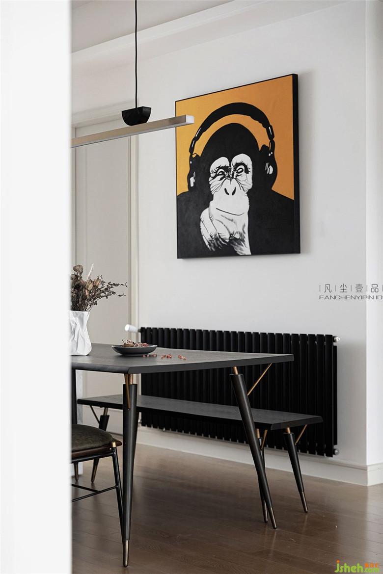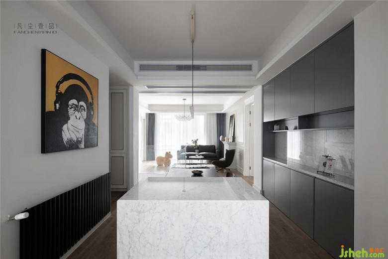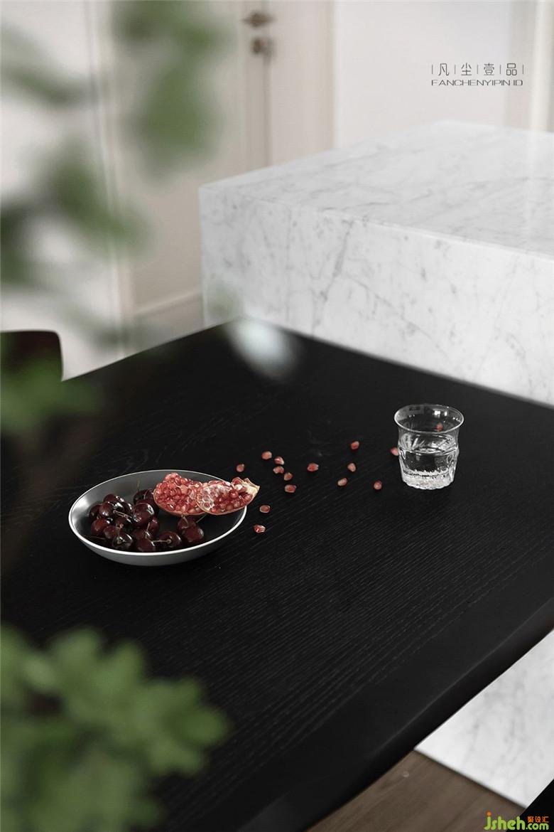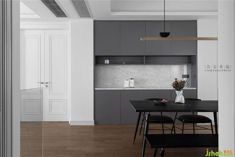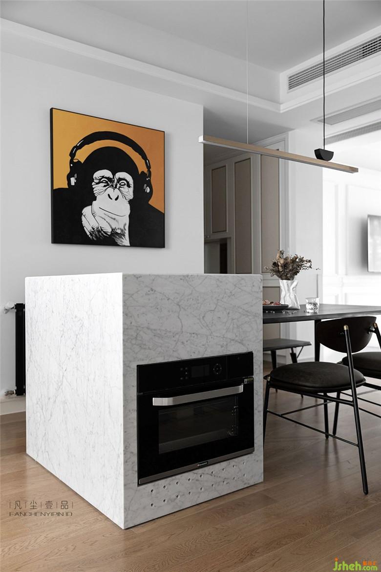 餐廳的中島+餐廳組合,利用原本就狹長的餐廳空間,設(shè)計一體式內(nèi)嵌烤箱和廚衛(wèi)電器組合,解決廚房空間無法再增加這些功能的現(xiàn)實問題。