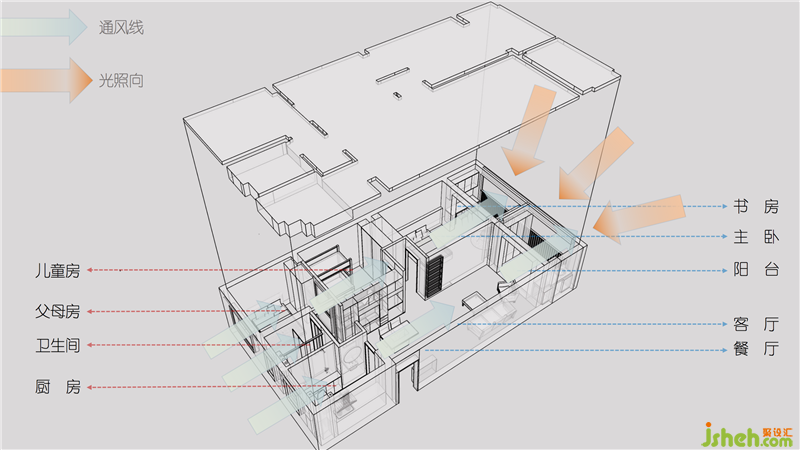1:要滿足老中幼三代獨立的居住私密空間,且都需要明光和自然通風(fēng)。