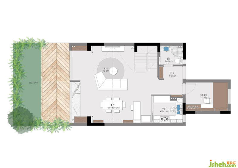 小孩可以在不管室內(nèi)還是室外不受拘束的玩耍;而父母可以擁有完美的觀察動線,可變動的敞開式廚房與餐廳用島臺空間過度,讓烹飪和就餐隨心所欲。