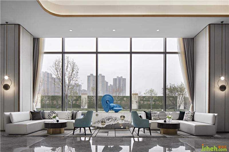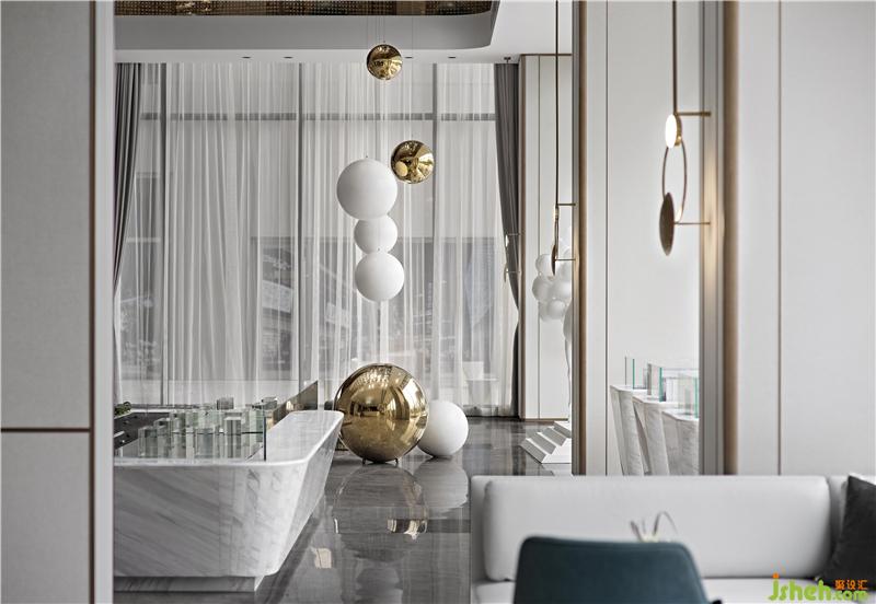洽談區(qū)奶白的色調(diào)勾勒簡潔、寧謐的商談氛圍,翡翠綠與透明小水晶疊合而成的裝飾吊燈,星光點點,觥籌交錯。有序的線條適度糅合,豐富了空間的層次,浪漫感與文脈精神合為一體,增加空間的藝術(shù)感染力。
