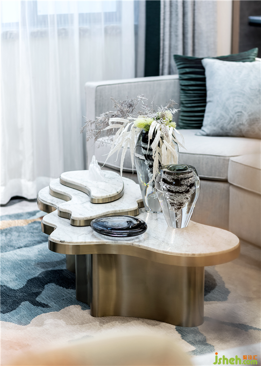 內(nèi)與外的界限已然模糊,似離而合的格局形成一種連接,蜿蜒的茶幾,靈感源于行云流水般的秀美梯田,將自然之美融于空間之中,流動的曲線感,賦予變化、起伏、生動的氣韻。同時,理石與古銅材質(zhì)的搭配,將現(xiàn)代感與自然的璞真悄然融合。