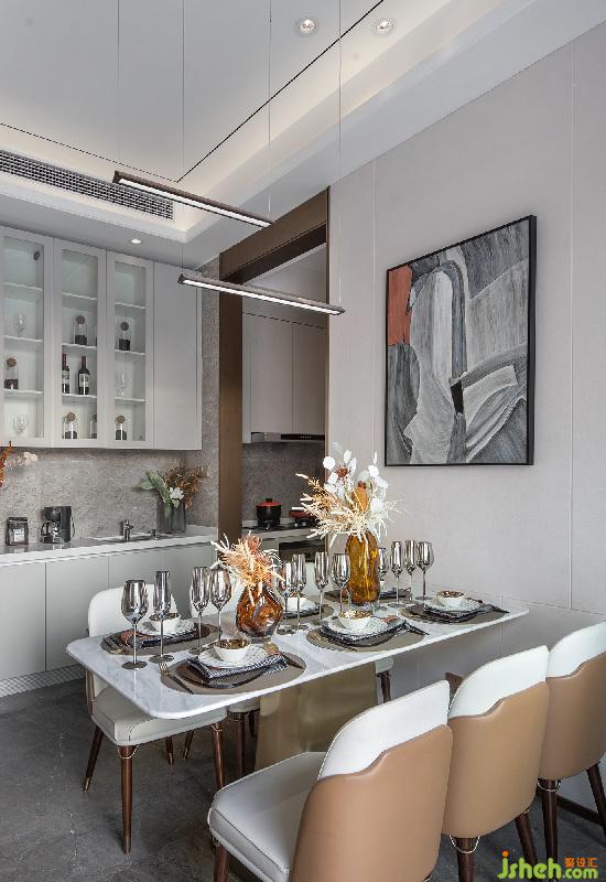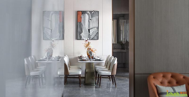 室內(nèi)家居色彩以米色與灰色為基底,再輔以時(shí)尚暖調(diào)的大地橘作為跳色,將自然質(zhì)感與都市風(fēng)尚完美兼合,優(yōu)雅大方,還不失親和。金屬元素、帶鏡面光感的材料、簡(jiǎn)約時(shí)尚的圓形茶幾、優(yōu)雅輕奢的水晶吊燈,無(wú)不在靜靜訴說(shuō)著港式的優(yōu)雅風(fēng)情。