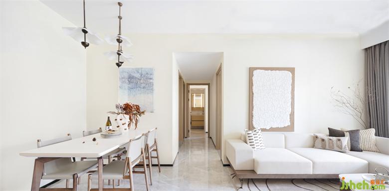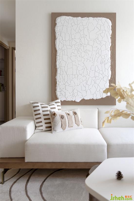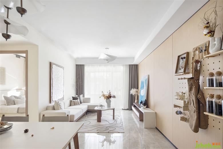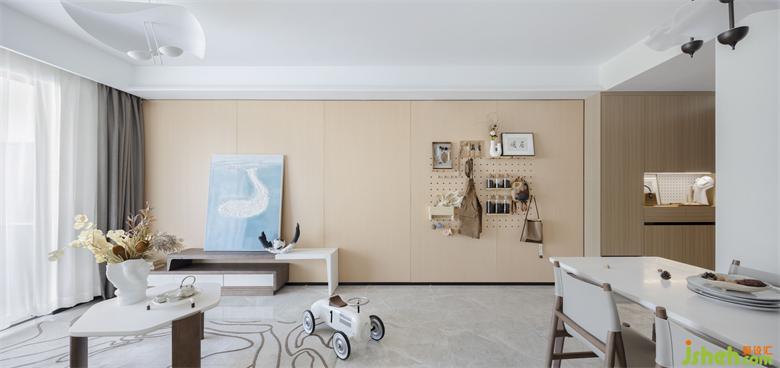 空間在大色調(diào)上運(yùn)用了低飽和度米白色為基礎(chǔ)色,利用大地色來中和樣板房設(shè)計(jì)空間的視覺,少許的天際藍(lán)作為空間的點(diǎn)綴色營(yíng)造出溫馨舒適的氛樣板房設(shè)計(jì)圍。