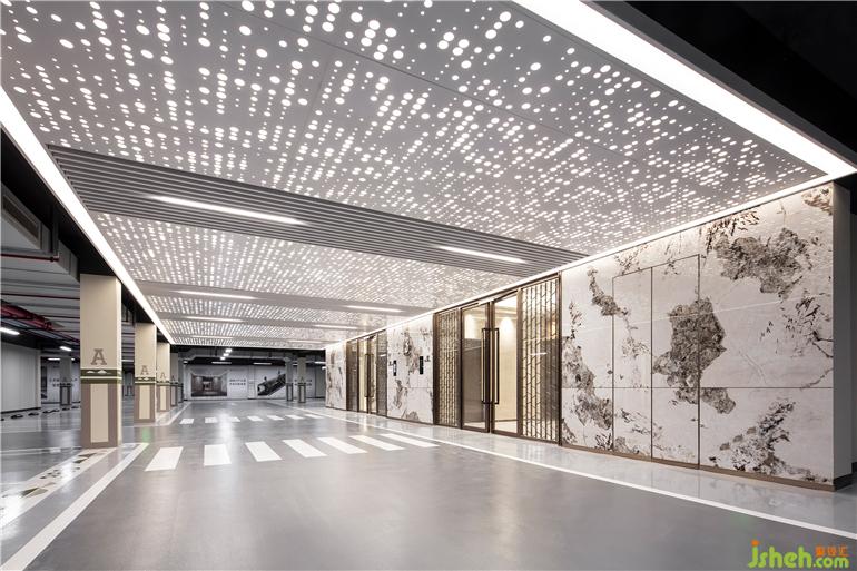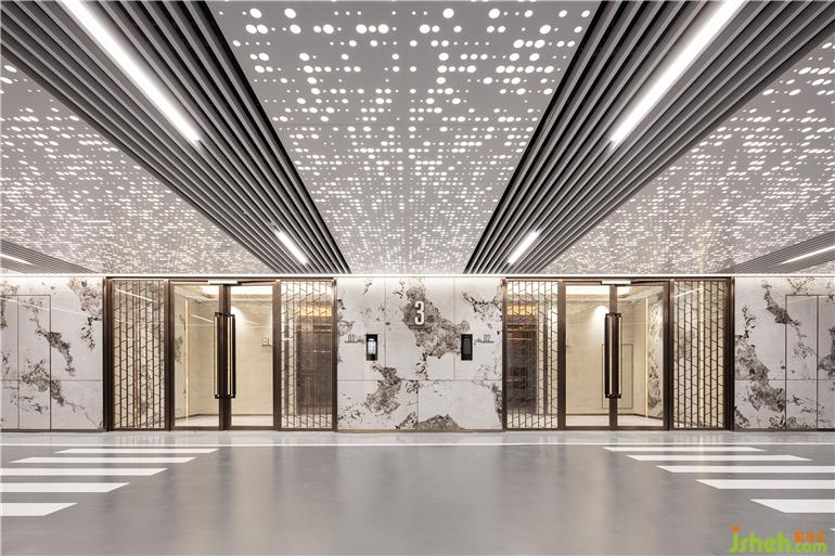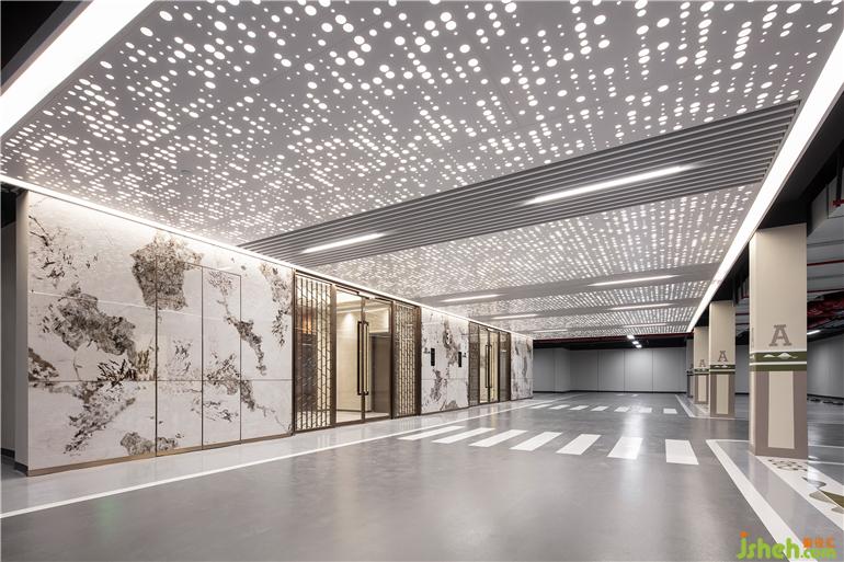 依托海洋文化,車馬廳的墻面和天花以沖孔板作為主要裝飾材料,與白色鋁格柵的組合使空間更具豐富的層次感,汕頭停車場設計讓住戶的歸家體驗如酒店般奢享品質感。瓷質薄板墻面延續(xù)著白、灰的色調,低調又奢華,在波光粼粼的天花板襯印下,宛如響著一曲浪花拍打礁石的協(xié)奏曲。