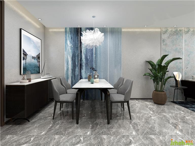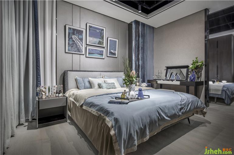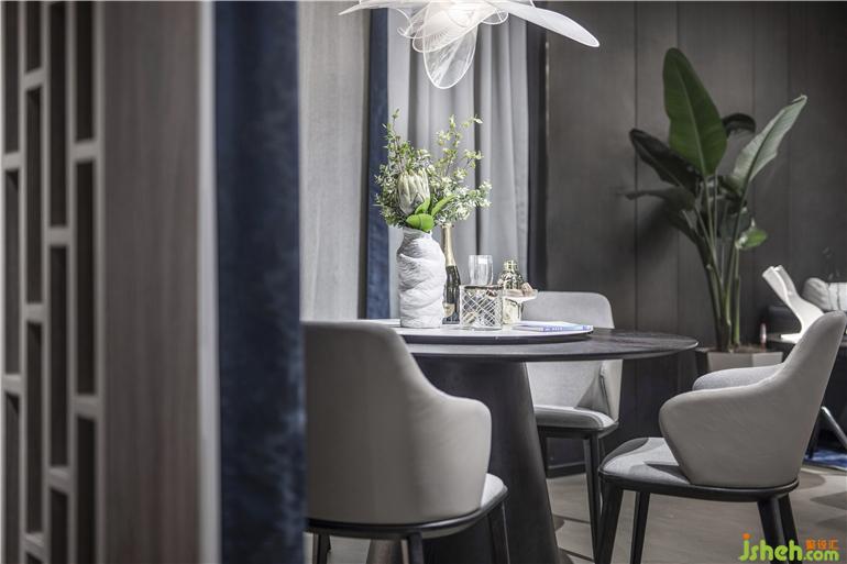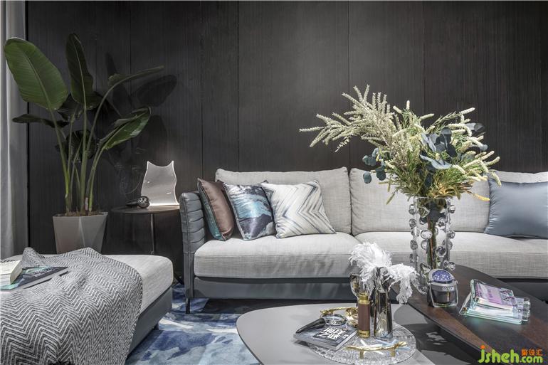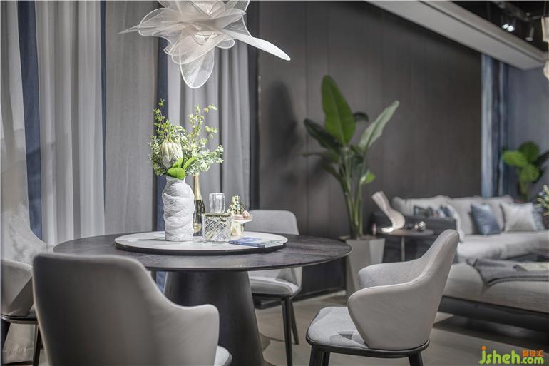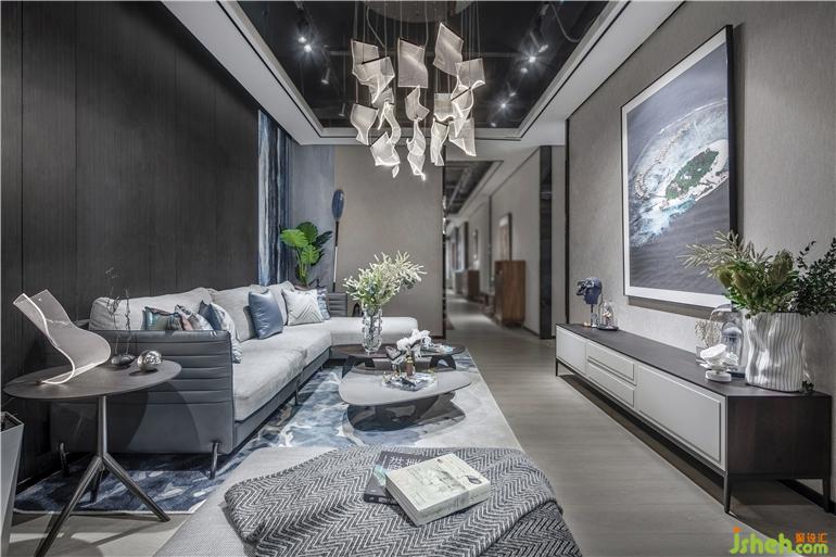 所有的家居都來自設計師精心的設計,定制出各式不同的圖案,展廳設計將海洋元素巧妙地運用到電視背景墻、掛畫、地毯、窗簾布藝之中。用漸變的藍色,掌握了色彩的藝術,將家居物件靠枕、單椅進行點綴,時刻凸顯海洋氣息;提取海面波光粼粼的元素作為地毯的圖案,吊燈的形狀提取了海洋生物的特征;看似簡單的茶幾,其實設計師在細節(jié)上做了“手腳”,桌腿是透明的玻璃,搭配波光粼粼的地毯,像是若有似無的浮在海面上。