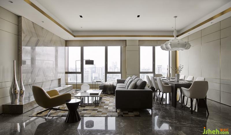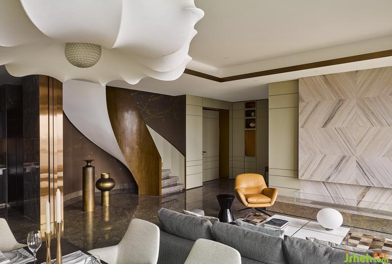 室內(nèi)通過石材、金屬、皮革等材質(zhì)的融合與對比,形成風(fēng)韻現(xiàn)代與優(yōu)雅古典的對話,渲染出國際大都會的俊朗風(fēng)度??蛷d以對紋理手法打造背景墻,豐富視覺觀感;壁爐升騰,暖意回升。窗外,精致璀璨的都市圖景盡收眼底,坐臥之間,遠(yuǎn)觀近袛,皆融入城市的熱流。