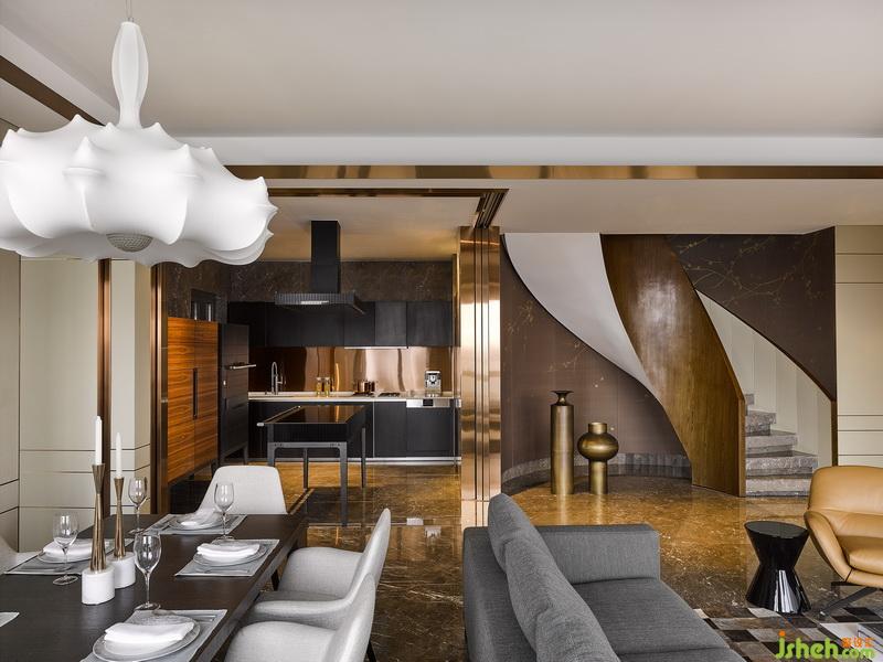 弧形樓梯蜿蜒而至,古銅擺件與立面手工壁紙自成一景。臺階拾級而上,將室內(nèi)與頂端露臺相連接,深色木材與皮革混搭,彰顯出對縫手法的魅力,讓情緒在不經(jīng)意間釋放。