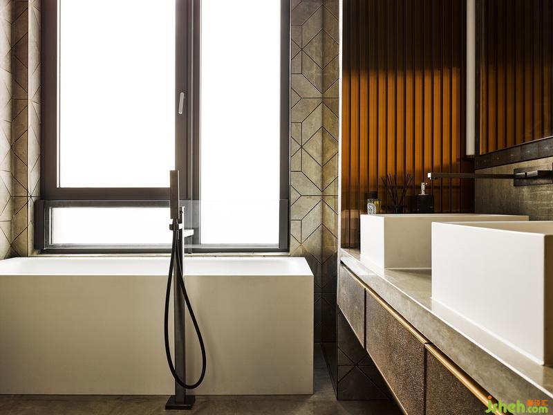 主衛(wèi)墻面大面積以幾何拼花彰顯出序列結(jié)構(gòu)之美,在燈光效果的渲染下,可謂色澤交錯(cuò),塑造出三維立體的視覺張力。頂端設(shè)一天窗引入光線,更是活躍了空間意境。