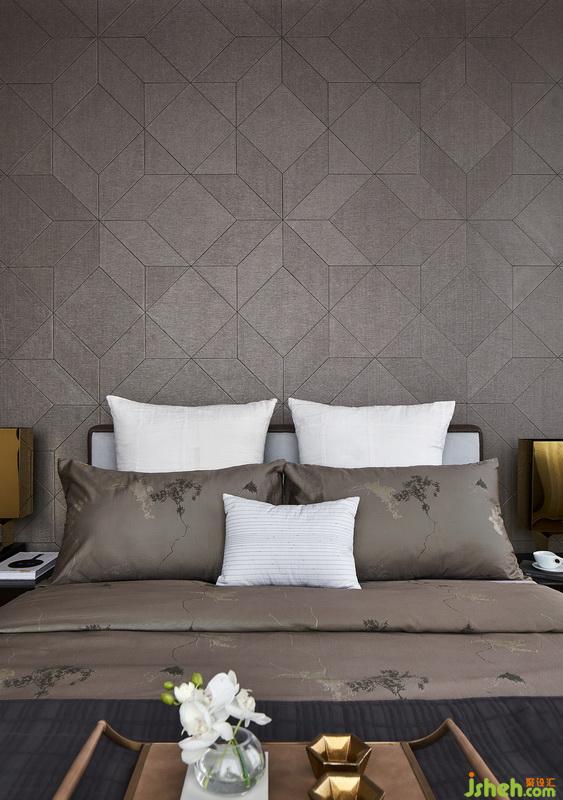 主臥采用塊面混搭來塑造空間,壁布硬包經(jīng)由U型內(nèi)凹金屬條的分割,一半濃烈、一半素雅,各具風(fēng)情。半包圍型床背由皮革嵌入木質(zhì),有效平衡立面視覺。