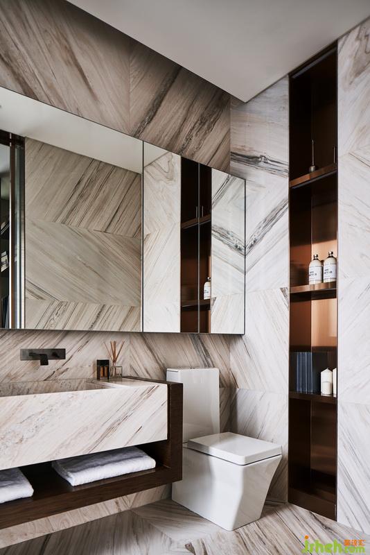 衛(wèi)生間延續(xù)客廳背景墻風(fēng)格,對(duì)紋大理石一體而上,右側(cè)面利用建筑原始?jí)w打造金屬展示架,兼具功能與美感。木質(zhì)呈懸浮U型包裹臺(tái)盆,映射出剛與柔的交融。