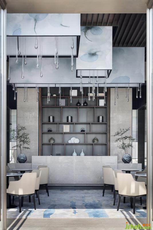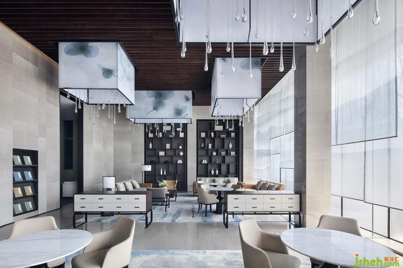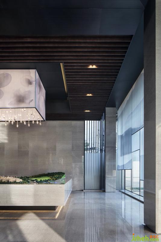 洽談區(qū)頂端延續(xù)沙盤區(qū)的手法,水墨暈染吊燈以體塊穿插于木格柵,其紋路似花瓣散落,又若云霧繚繞,而正要墜下的水滴狀進一步提升其空靈意境。開敞式布局在收放自如中平衡著空間的取舍之道,色澤、形態(tài)、體量和諧融入整體空間,陽光透過簾幔映入其中,從立面到頂面,詩意的格調(diào)躍然而出。