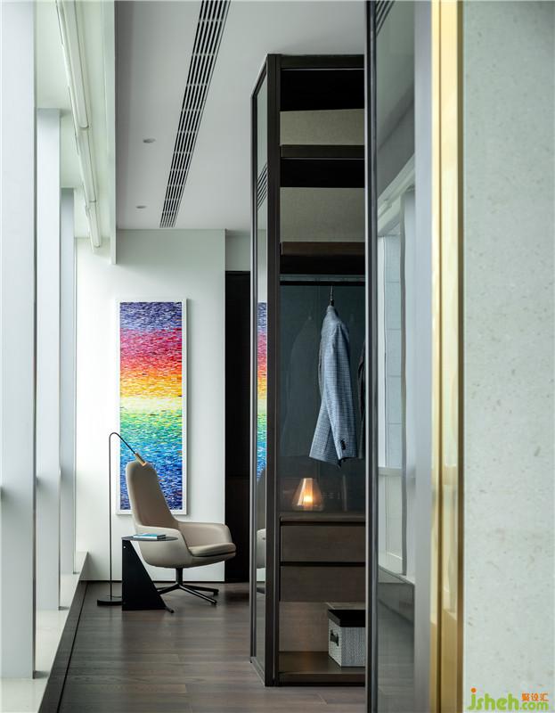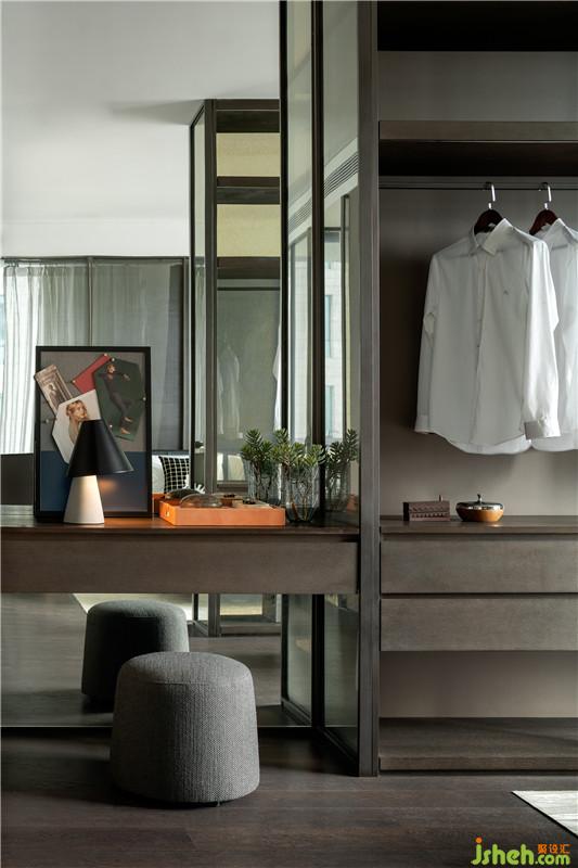 衣帽間與臥室的環(huán)繞型動線讓整個空間更加聯動、緊密,夾絲玻璃、鏡面的精心設置,虛實交融,讓空間有效舒展,又凸顯層次。