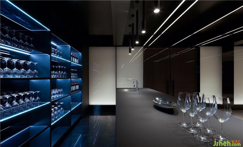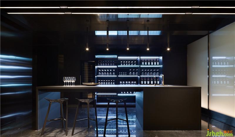 地下一層為休閑娛樂空間,品酒區(qū)、臺(tái)球室、影音室、乒乓球室一應(yīng)俱全,滿足業(yè)主多元化的功能需求。臺(tái)球室與品酒區(qū)一體而成,經(jīng)由俊朗的材質(zhì)強(qiáng)調(diào)線條垂直感以及映射延展性,塑造出豐富的立體構(gòu)成。
