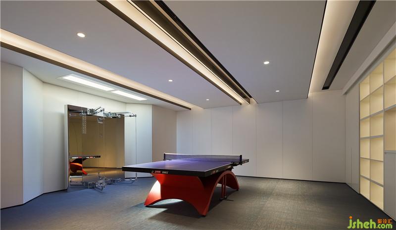 乒乓球室以白色為主基調(diào),簡(jiǎn)潔明快的清爽氣息撲面而來(lái)。健身器材上方的人造光頂精妙模擬自然光照,仿佛于自然中暢快淋漓揮灑汗水。