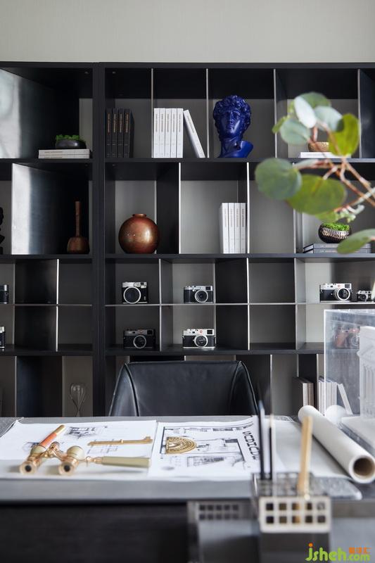 書房則以沉穩(wěn)為主基調(diào),不規(guī)則書架設(shè)立多樣陳列方式,格架大小不一,擋板傾斜角度各異,兼具功能、特色與美觀,同時便于物件和藏品的展示和存儲。