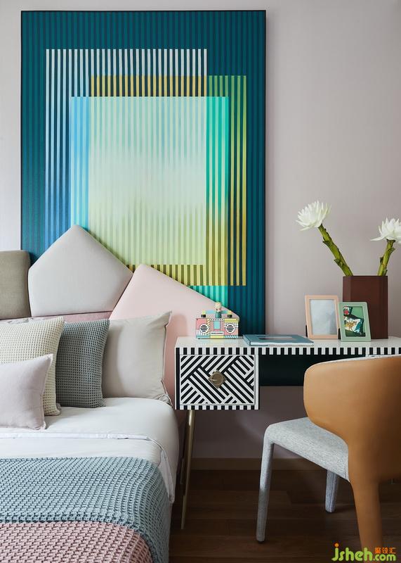 長輩房以淺灰色壁布鋪陳,墻面借用非常規(guī)的側(cè)面裝飾畫營造現(xiàn)代氛圍,以柔和亮色作映襯,渲染一種親和淳樸、安享自身的人生態(tài)度。
