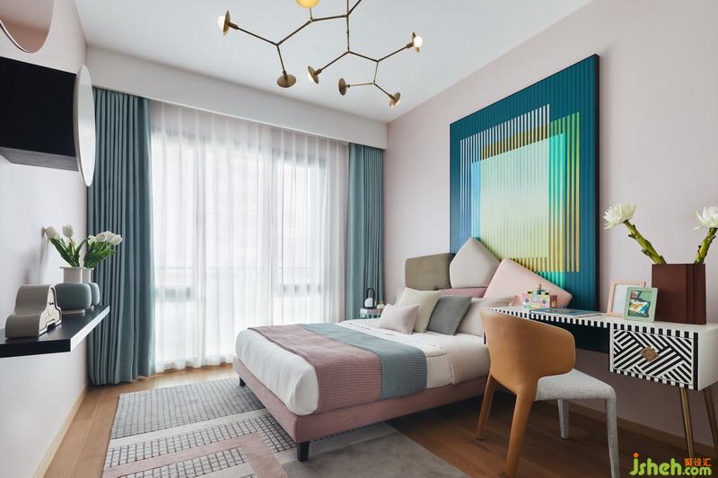女孩房追求粉嫩、歡快、活潑的氛圍,大尺寸裝飾畫將床、書桌連為一體,強化高低錯落之感,化散為整,裝飾畫與書桌條紋又各相呼應(yīng)。不規(guī)則枝丫型吊燈裝點天花,瞬間多了一絲俏皮與靈氣。