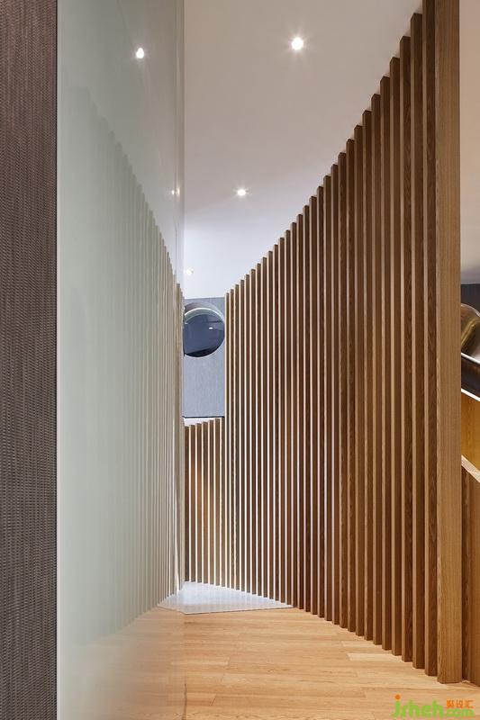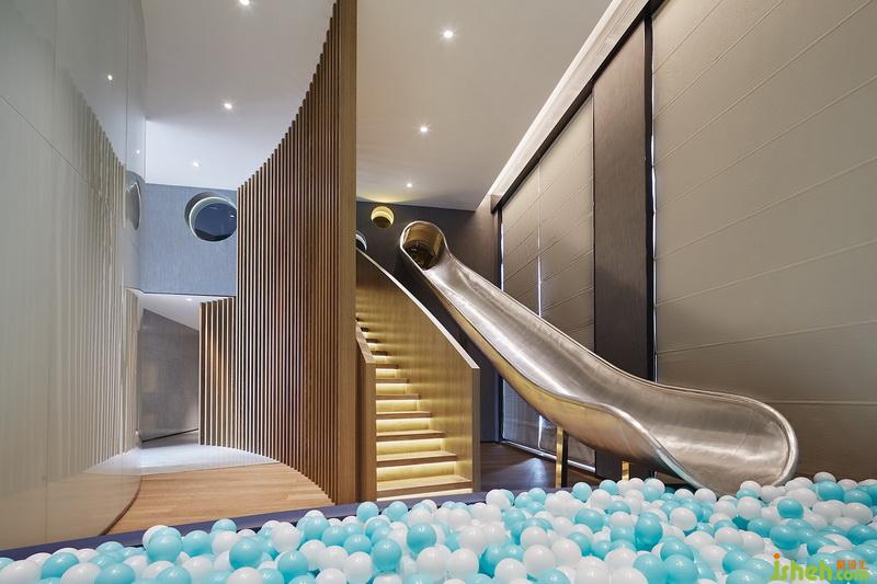 衛(wèi)生間上方開(kāi)辟夾層設(shè)置兒童天地,作為上下空間的連接紐帶,格柵、樓梯、滑梯仍舊貫徹弧面姿態(tài)?;菹旅媸菤g樂(lè)的海洋世界,夾層樓上則是浩瀚的宇宙天際,在寓教于樂(lè)中激發(fā)孩童的好奇心與冒險(xiǎn)精神。