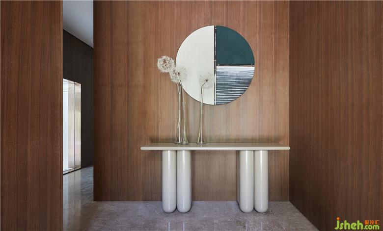 獨立的玄關(guān),以個性端景臺作為承載,開啟歸家的儀式感。純粹克制的視覺中,又不乏含蓄的肌理變化。于此間也有整個空間中形、色、質(zhì)設(shè)計要素的映射與縮影。