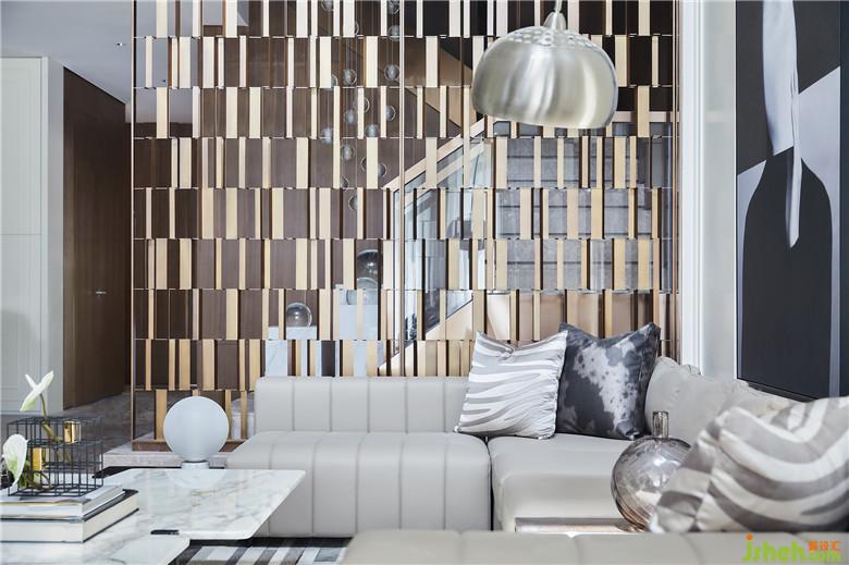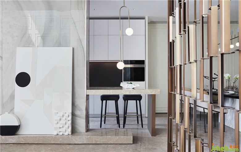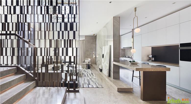 挑高6.5米的客廳,沙發(fā)后方背景線板一貫而上,透過對面的夾絲玻璃與廚房以及二樓客臥套間相望,另一側(cè)借助半遮擋半通透的金屬屏風與樓梯對話。此外,客廳亦與吧臺、餐廳開敞聯(lián)合,有效拓展了公共區(qū)域的活動范圍與分區(qū)層次。