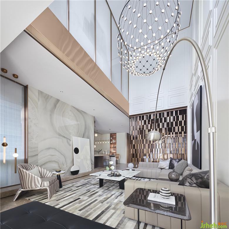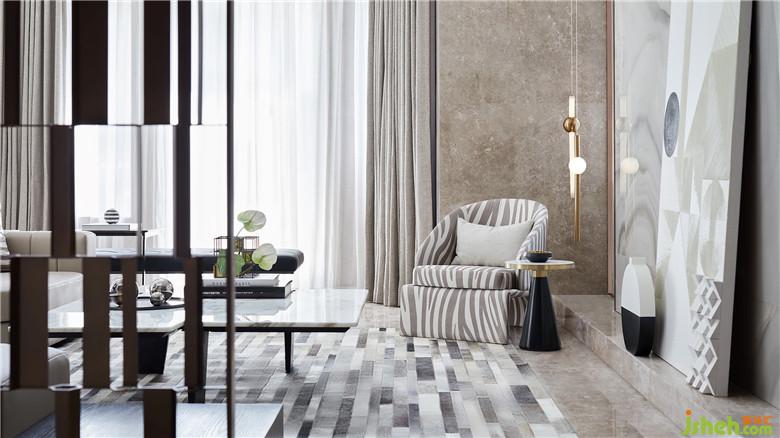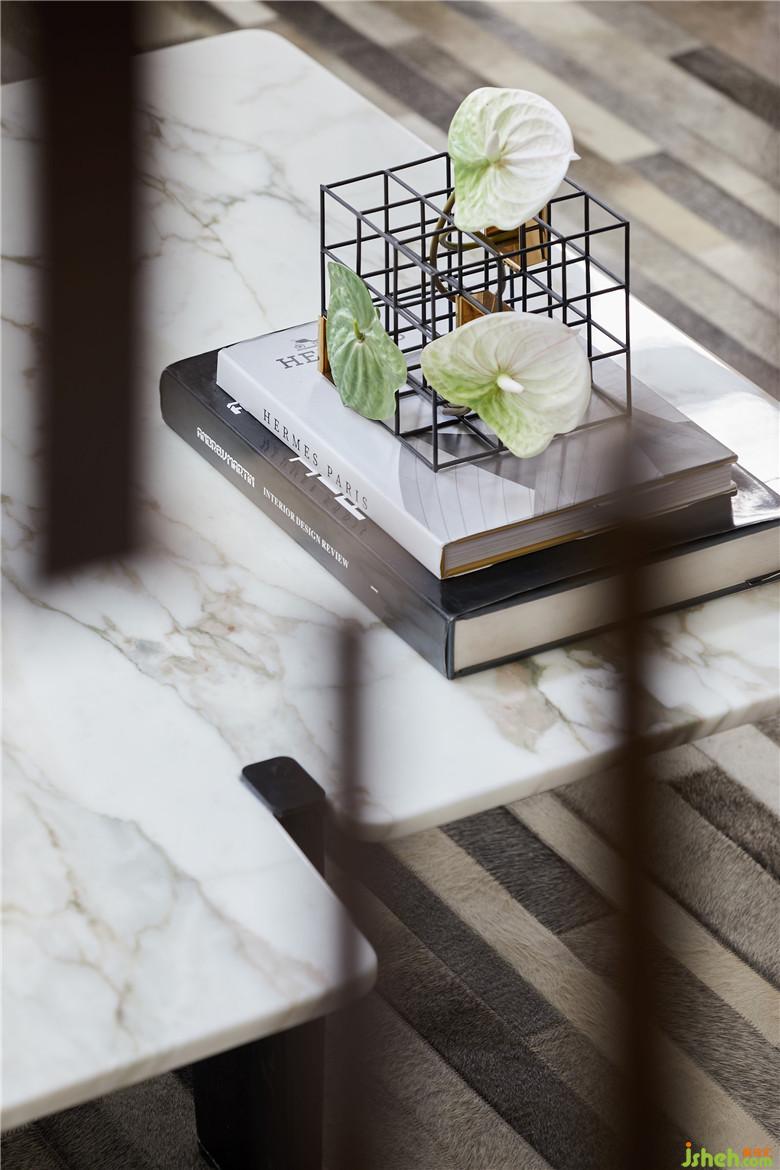 設(shè)計(jì)元素的呼應(yīng)與融合在此運(yùn)用嫻熟:客廳兩端立面的畫作,均由黑白灰三色演繹,以簡約的筆觸勾勒藝術(shù)感知;背景線板與沙發(fā)都極具體塊與線條韻律,后方非常規(guī)尺寸的畫作將人的視線自然引向上方,銜接之余又散發(fā)出一種不可言說的魅力;條塊狀金屬屏風(fēng)衍生的錯(cuò)位分割感,也在兩幅畫作、茶幾、牛皮拼接地毯上得到體現(xiàn)。