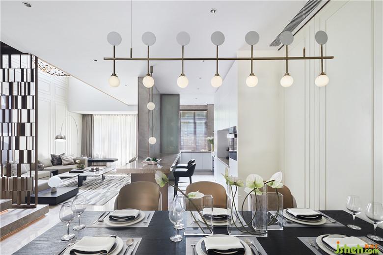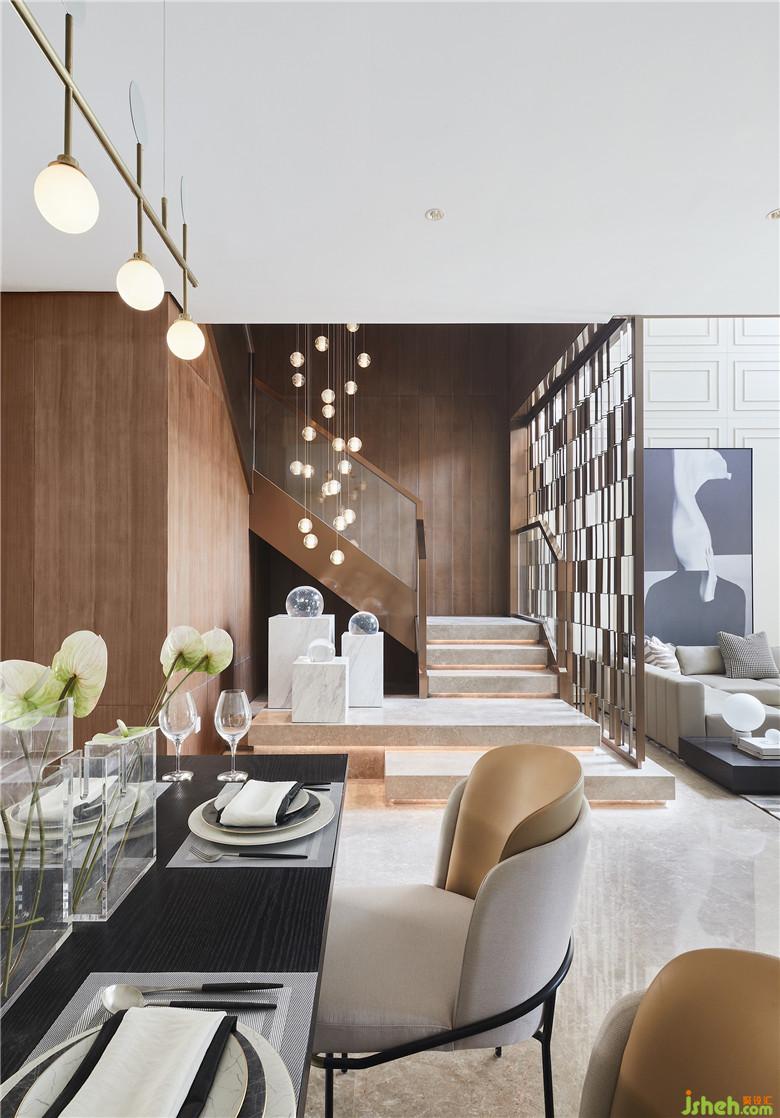不同的材質(zhì)、造型、色澤于餐廳交織,錯(cuò)落有致,立面沿用大塊面線板充當(dāng)最適宜的調(diào)色板,渲染出典雅且輕松的用餐環(huán)境。