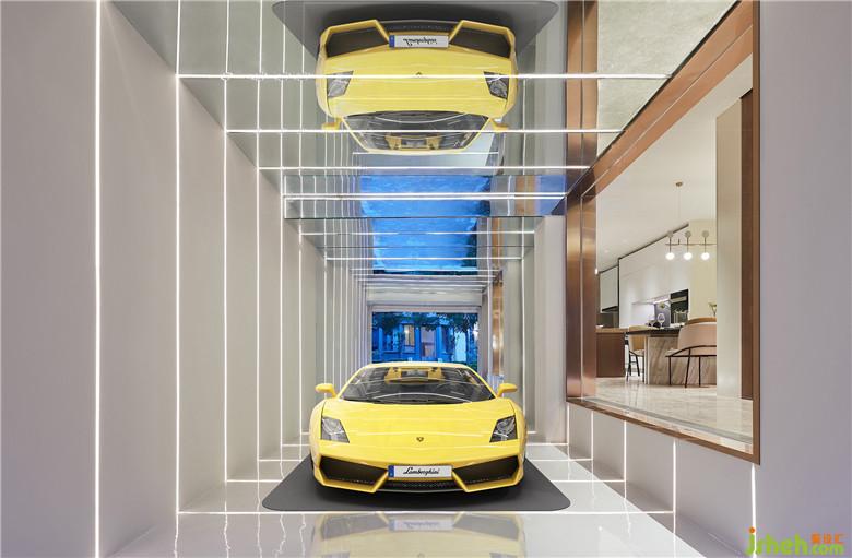 車庫借由立面與頂面的鏡面反射,與LED燈帶一起,構(gòu)筑虛實(shí)層疊與縱深擴(kuò)容的效果,科技感十足。透過右側(cè)玻璃與餐廳、過道互動(dòng),車庫化身精美展廳,并成為室內(nèi)頗具玩味的一景。