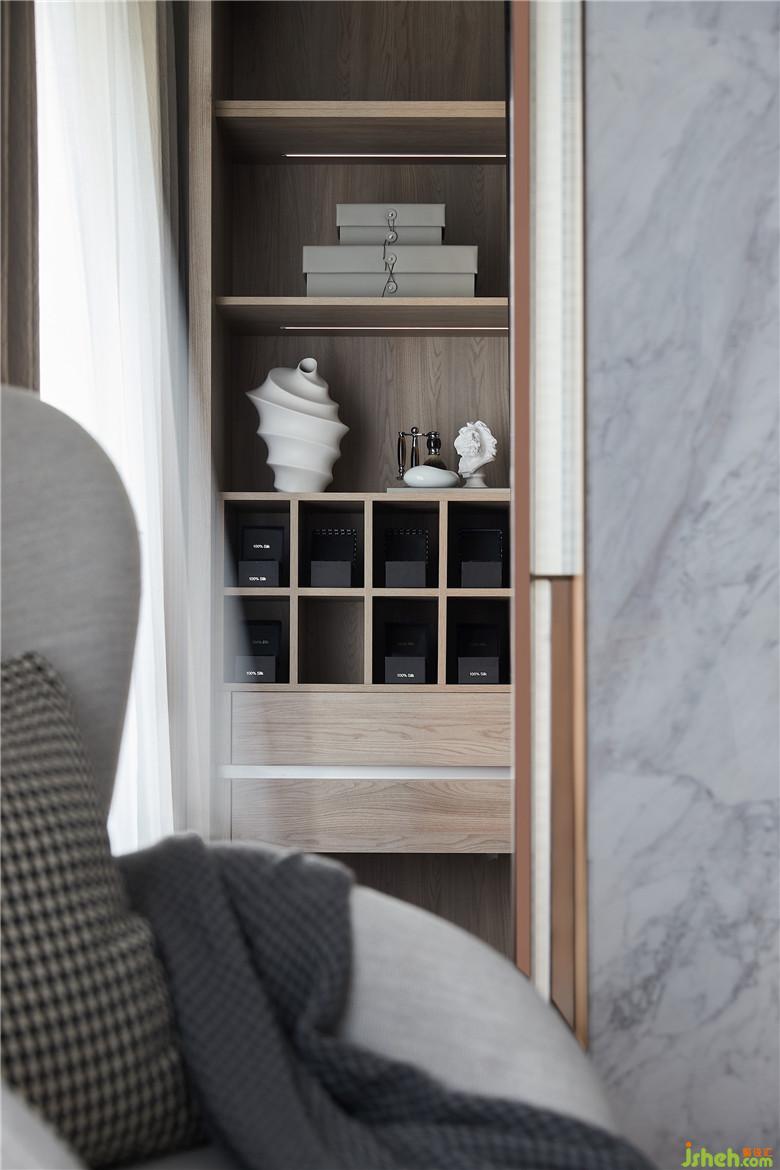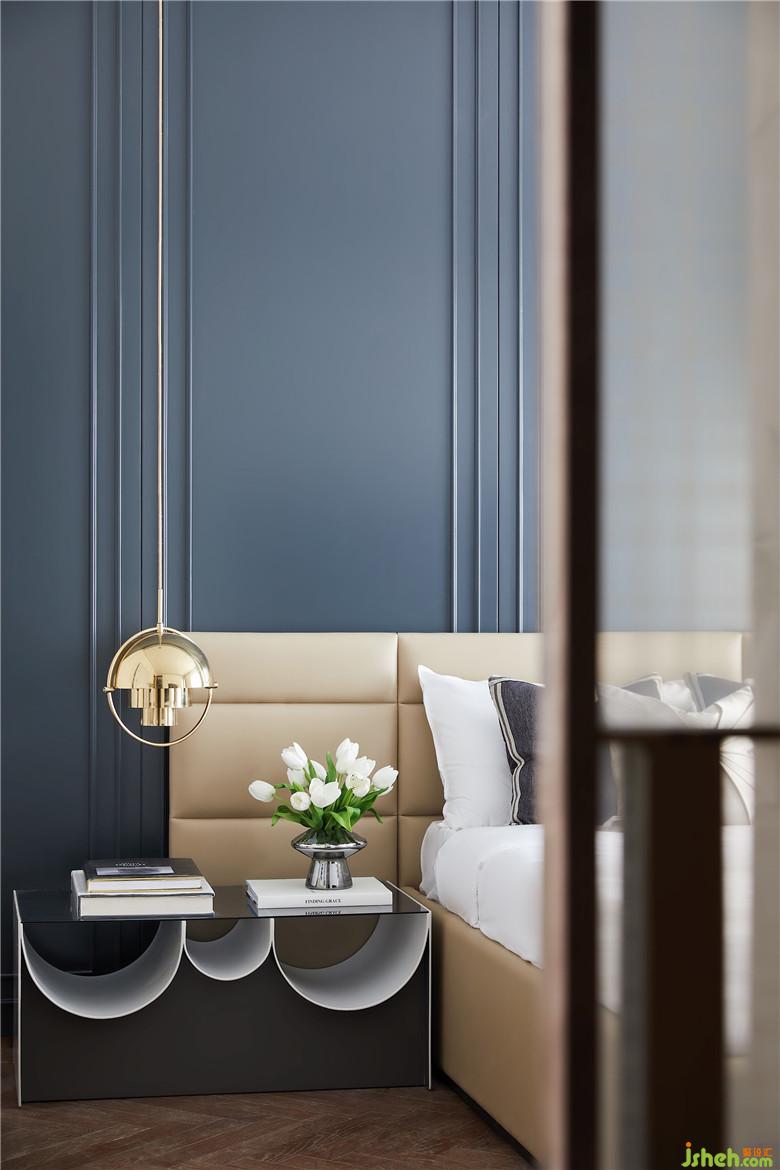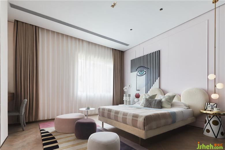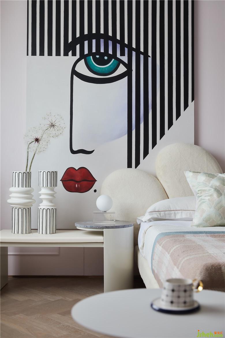 兩側床頭柜,呈現(xiàn)方中有圓、圓中有方的組合形態(tài),配合輕盈、神秘氣質的畫作,讓一抹優(yōu)雅回蕩其間。
