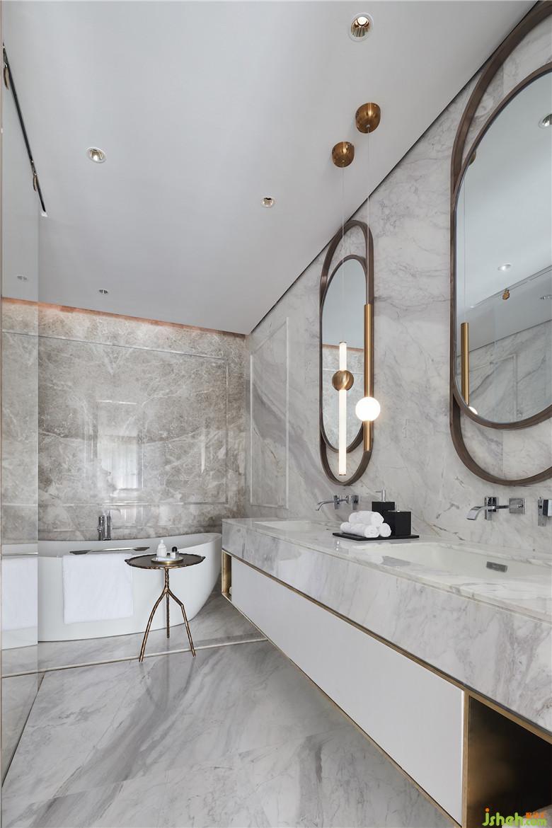 衛(wèi)浴石材背景墻和一樓的線板設計如出一轍,并作造型延伸。臺盆鏡則近似橢圓的樣式,柔化了棱角,讓衛(wèi)浴時刻更趨自在放松。