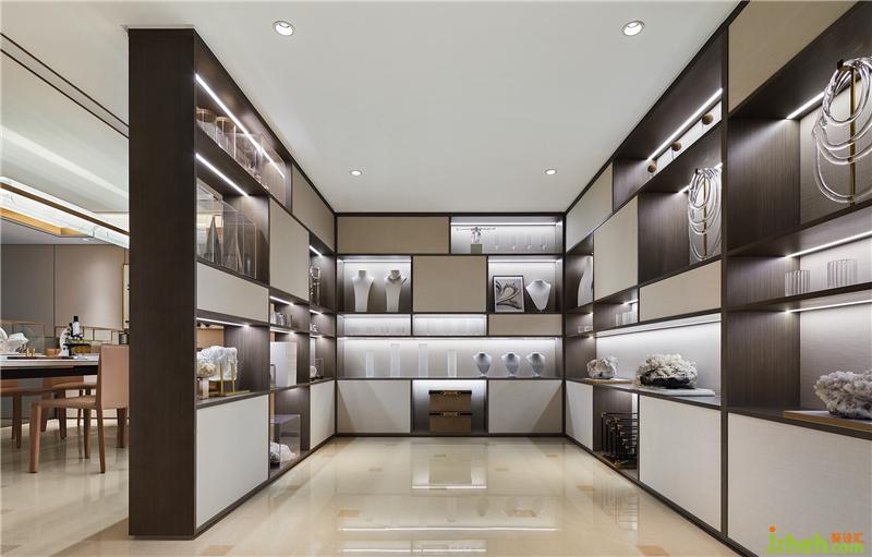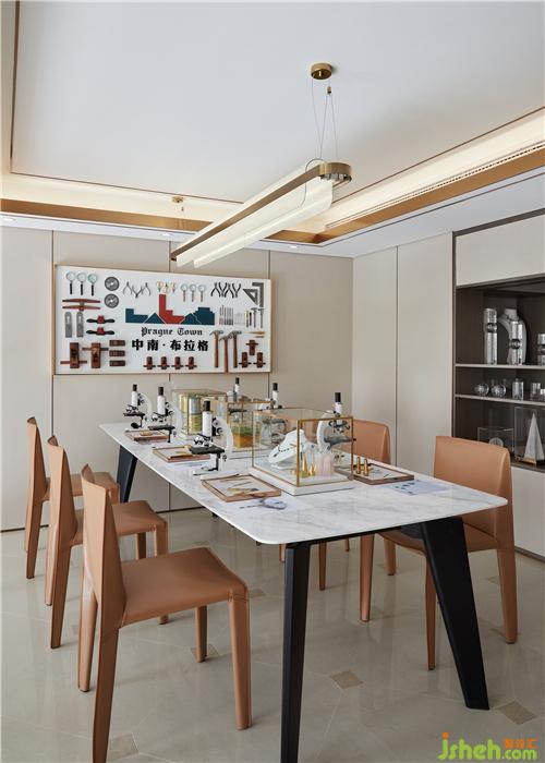 背后的珍品展示區(qū)則由大小各異、高低錯(cuò)落的格架組成,配以燈帶點(diǎn)綴,以穿插、通透實(shí)現(xiàn)區(qū)域間的互動(dòng)關(guān)系,打破了常規(guī)的沉悶,極具美感與趣味性。售樓處設(shè)計(jì)