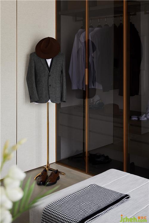 在陽(yáng)光映射下,沿用金屬與玻璃材質(zhì)的衣帽間,釋放出干練型格與微妙張力。既凸顯其本身的光澤與韻味,又保證了與套間的溫暖聯(lián)結(jié)。