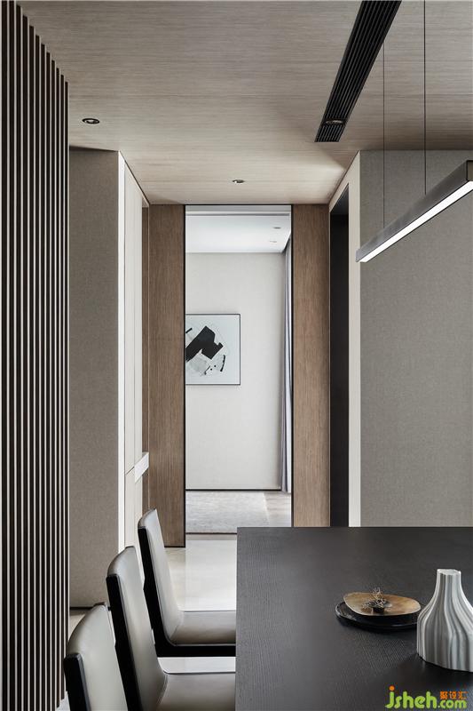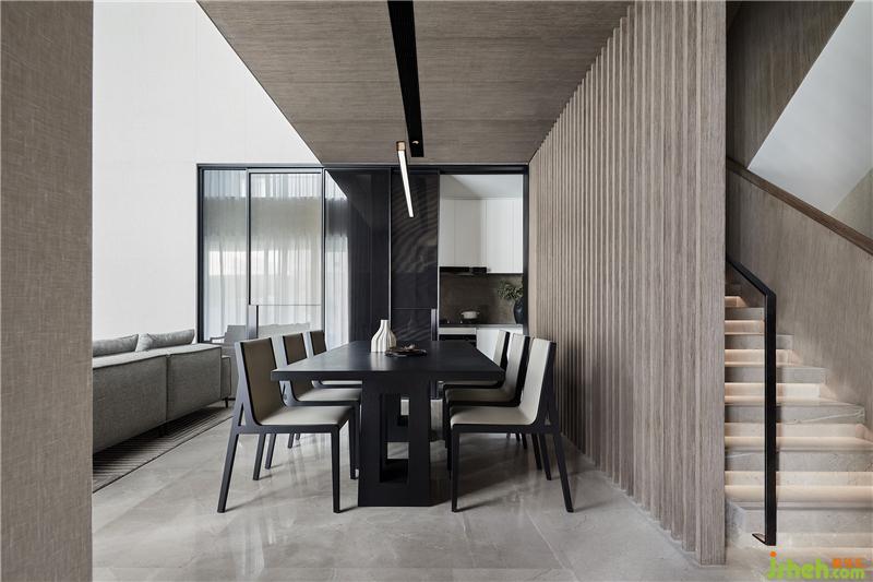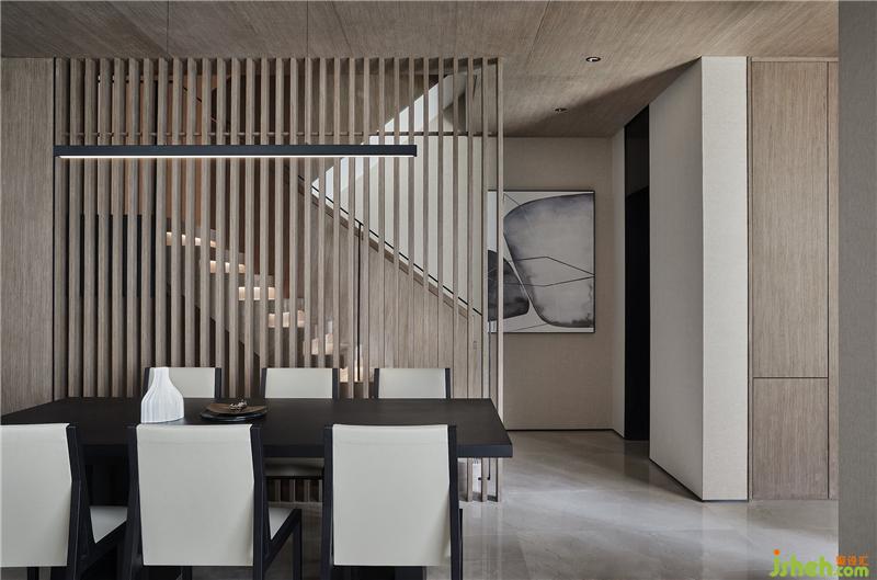 秉承了壹舍一貫的克制平衡之道,客餐廳避免過多元素堆積,在滿足需求之外,又透露出分區(qū)美學。挑高的一側立面如同階梯狀漸次內退,餐廳因勢而生,這是尺度上的自然而然,也是對塊面關系的靈活統(tǒng)籌。