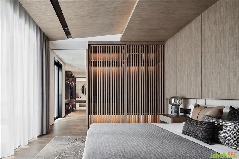 二樓的主臥套間進(jìn)一步精研空間的穿透與情趣。設(shè)計(jì)師從山巒的層疊中捕獲靈感,在大塊面的延伸、穿插與碰撞之間,構(gòu)成錯(cuò)落的關(guān)系。左右滑動(dòng)式的木格柵柜門設(shè)置,滲透出別樣的自在與柔和。