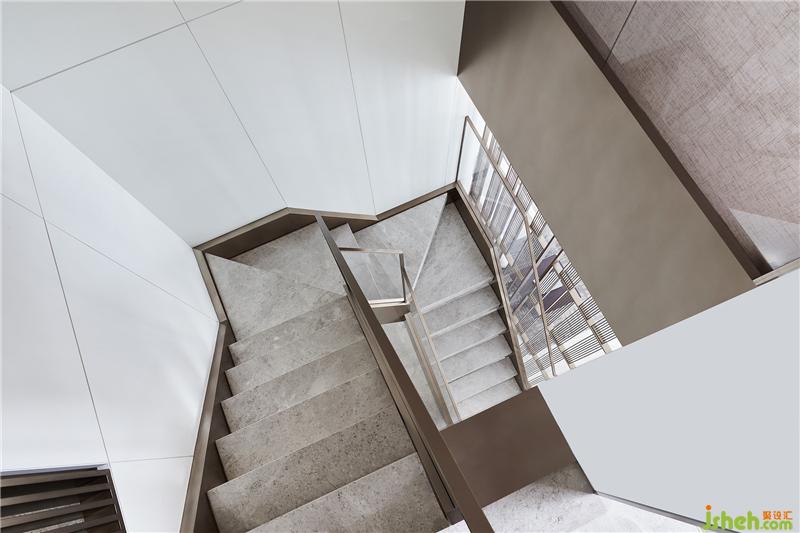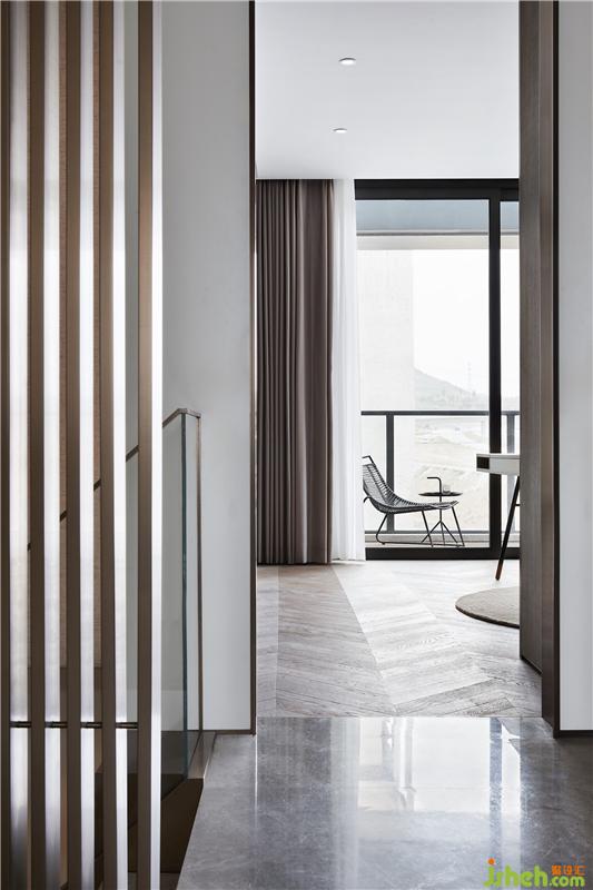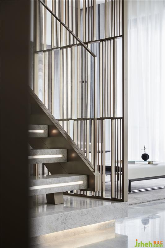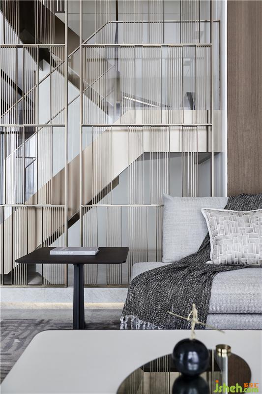 金屬格柵將樓梯與客廳聯(lián)動(dòng)起來,既有一定的韻律節(jié)奏,又并非完全規(guī)整的形式,在靈動(dòng)與透氣的布局中,凸顯了樓梯主體的雕塑美感。又因材質(zhì)的延續(xù)、疊加使用,釋放出精簡(jiǎn)純粹的張力。樣板房設(shè)計(jì)