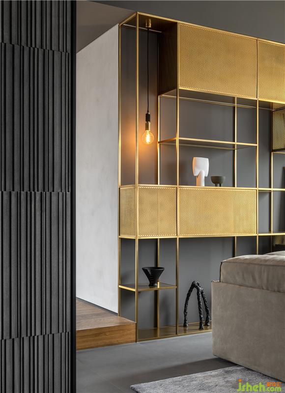 客廳受結(jié)構(gòu)的限制及業(yè)主的要求,進(jìn)行了適度的比例縮放。大面落地窗加強室內(nèi)外的聯(lián)動,南浦大橋美景盡收眼底。軟裝陳設(shè)在素凈的基調(diào)下盡顯隨性自由氣息,力求還原生活本真。L型沙發(fā)極盡柔軟,而定制的黃銅格架,借由沖孔板的穿梭點綴,在不拘一格的形態(tài)關(guān)系中有效拉升層次,可謂恰到好處的調(diào)和。