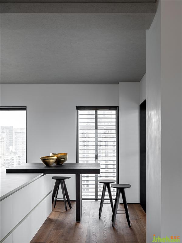 餐桌與島臺一體順延,呈疊級狀起伏,與西廚區(qū)的開放互聯(lián)也遵循著豪宅應(yīng)有的比例尺度。三面落地窗讓這里擁攬絕佳的視野與采光,透過形態(tài)、材料、色澤與細(xì)節(jié),越發(fā)詮釋出大都會的俊朗風(fēng)度。這是裝修設(shè)計團(tuán)隊對一貫的克制平衡之道的踐行,蘊藏著對簡約美學(xué)的嚴(yán)謹(jǐn)思考,也無一不透露出對品質(zhì)感的嚴(yán)苛追求。