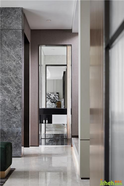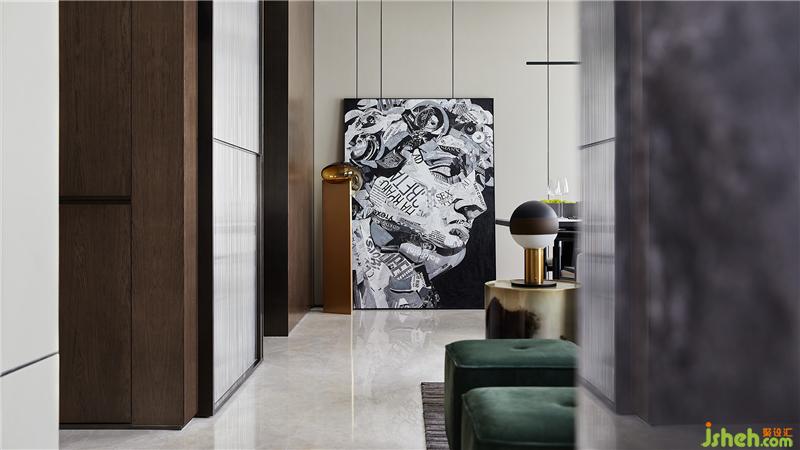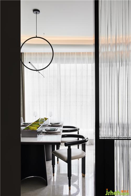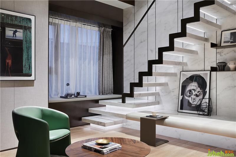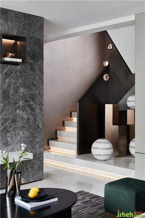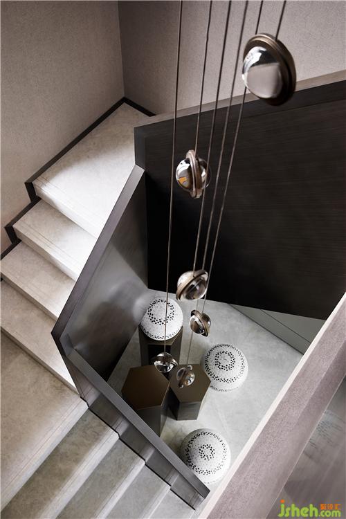 樓梯以平臺延伸的形態(tài)充當踏步的前奏,柱體和球狀的組合關(guān)系,也延續(xù)了積木盒子的概念,在嫻熟的結(jié)構(gòu)處理中演繹場域的力量與美感。隨一體下垂的吊燈盤旋而上,似乎離幸福也更近了。