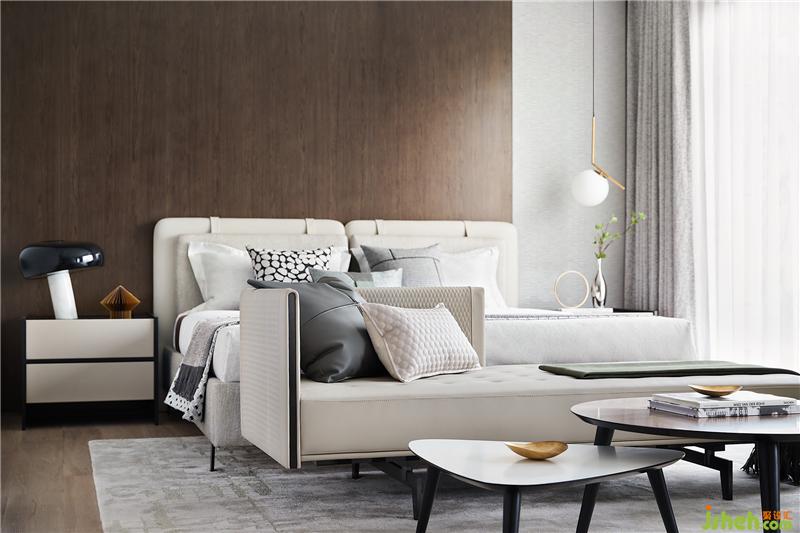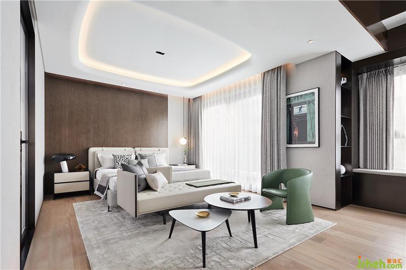 溫潤的木與柔和的米色調(diào)鋪陳主臥睡眠區(qū),散發(fā)出一種雅致溫馨的韻味,藉由皮革、布藝與木質(zhì)自如融合,予人安心怡然之感。復(fù)式裝修設(shè)計