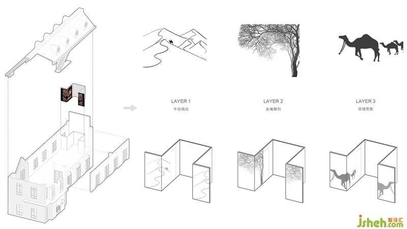 樓梯間通過(guò)解構(gòu)手法,以洞口與金屬燈飾的體塊穿插造景,簡(jiǎn)練有力、又耐人尋味。循此前往即將踏上“絲綢之路”,邂逅萬(wàn)千情致。