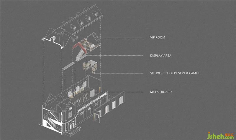 不遠(yuǎn)處的紅色斜頂與金色盒子的搭配,則讓歷史與舞臺(tái)元素彰顯得更加濃烈。VIP室采用懸空式展現(xiàn),仿佛駝峰的外化,又像輝煌的宮殿,這也是絲綢之路主題的進(jìn)一步完善。