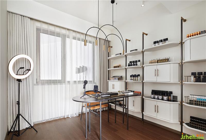 背景墻由木飾面到石材的轉變,也意味著場所的步步深入。同時將金屬板嵌入,極具特色的置物格架亦由此而生。多種材料的冷暖調和,在色彩與幾何元素的融合碰撞中,構筑優(yōu)雅格調。