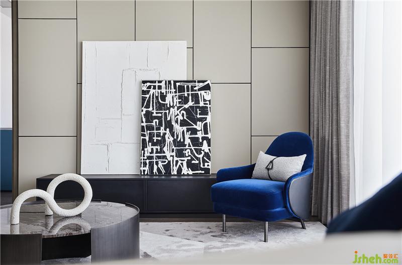 客廳以弧度的沙發(fā)和茶幾渲染輕松氣氛,背景墻通過金屬條進行韻律劃分,配合畫作,呈現(xiàn)方正與圓弧的碰撞之美,這也是一種剛?cè)峒鏉木狻?