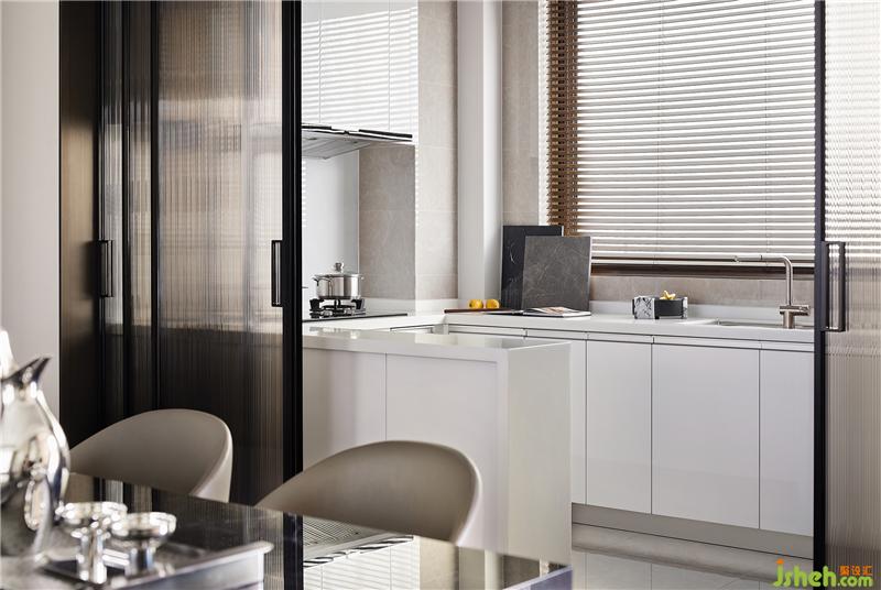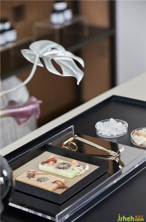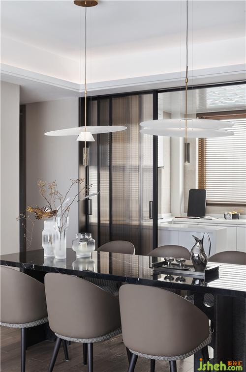 精巧的選材、用色在餐廚區(qū)也得以延續(xù),又在輕重、明暗、深淺有別中,形成反差對比。此外,樣板房設(shè)計塑造美觀的同時還注重強調(diào)日常細(xì)節(jié),并以玻璃移門的開合之道勾勒出滿滿的品質(zhì)感與儀式感。