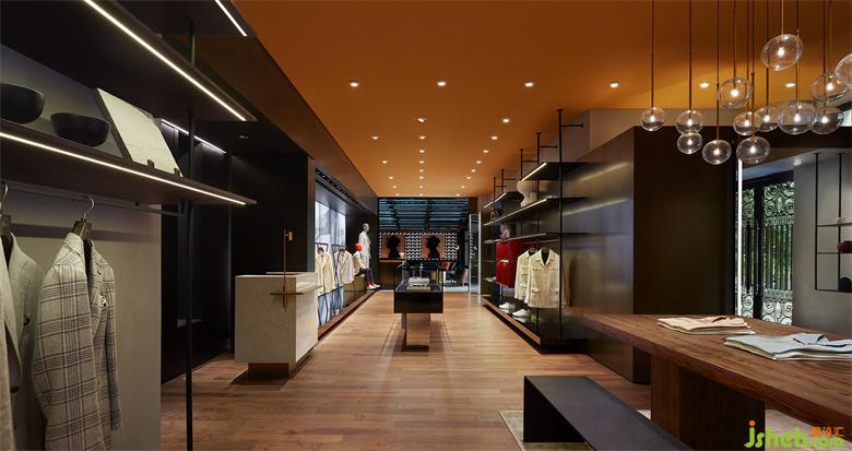 不同的是一面墻體已拆除,頂面一體蔓延向前,一字排開型布局盡顯通透連貫之氣。男裝店鋪設(shè)計(jì)師注重設(shè)計(jì)語言的貫徹,強(qiáng)調(diào)材質(zhì)、結(jié)構(gòu)、色澤的整體性與流暢性,以期達(dá)成一期和二期的無縫銜接。