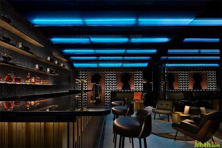 作為藏身于Smelix里面的酒吧,高定男裝的特色元素也得以延續(xù)與強化。大塊黑布鋪陳打底,由量體裁衣的皮尺刻度演變而來的坐標(biāo)格網(wǎng),以紳士剪影疊映其上,白色襯衫衣領(lǐng)圍繞四周,以及另一側(cè)墻面上縫紉機的加持,皆從多維度喚醒主題印記。