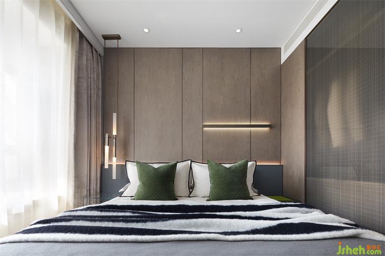 主臥套間在舒緩的基底下,深淺色階巧妙過渡,并讓橫向線條與豎向分割無形對話,慢慢推導(dǎo)出視覺中心點。溫潤的木飾面輔以燈帶烘托,潛移默化中鋪墊出細膩的感受,身處其中能令人放松、舒緩下來,給予內(nèi)心深處的庇護與安寧。