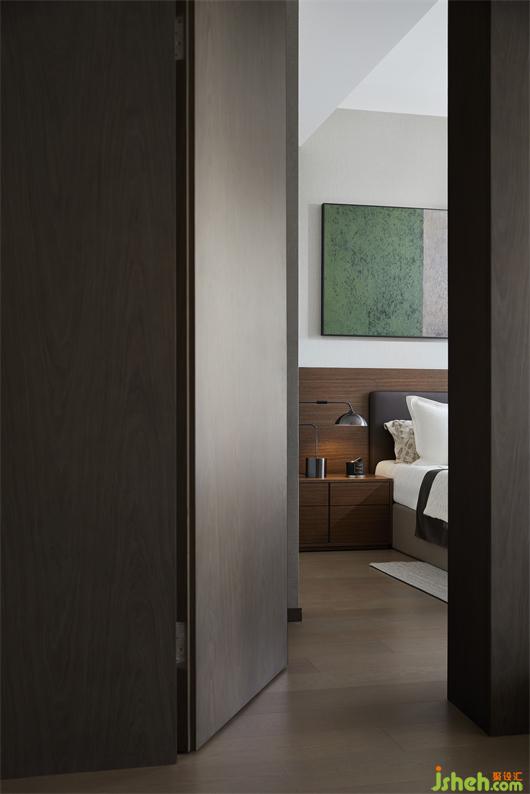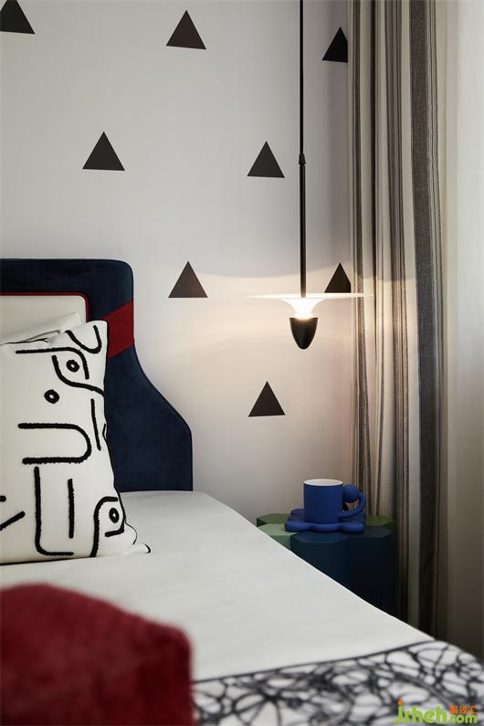 次臥同樣遵循利落簡潔的手法,塊面的疊層之感從床品蔓延至床頭背板,在變化與銜接中形成碰撞,勾勒出多維的層次。看似隨性,實則有內(nèi)在的邏輯關聯(lián)。
