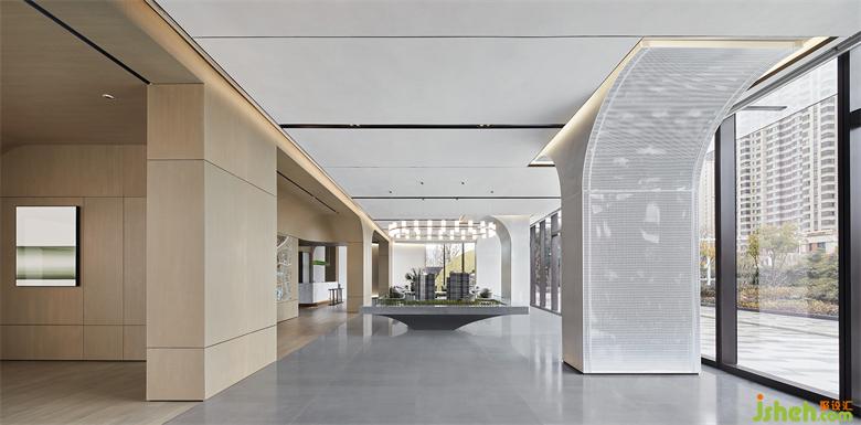 納自然之形,塑空間之意,大片落地窗帶來通透明亮之感,光影順勢漫步閑庭。南京售樓處設(shè)計(jì)基于建筑本身的原始結(jié)構(gòu),白色沖孔板與鏡面特殊處理包裹著的立柱,以半拱形體態(tài)錯(cuò)位而設(shè),打破常規(guī)呆板,弱化體量感,虛實(shí)結(jié)合,饒有情趣。