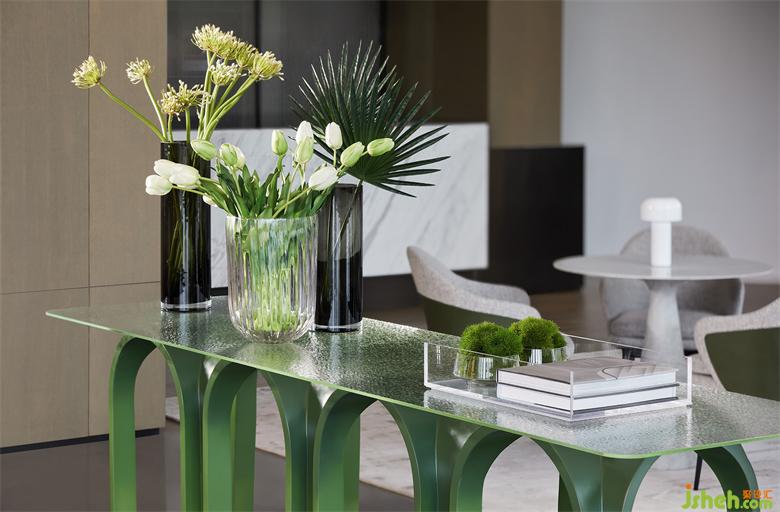 室內(nèi)造景亦別出心裁,參照高端酒店的花藝陳設,輕薄的臺面之上承載著對生命與四季的感悟,安定而立,以柔性的姿態(tài),打破單調(diào)與拘束。底座支撐也再現(xiàn)了對拱形的發(fā)揮與運用。
